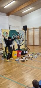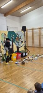 Hudomušna sraka je otroke popeljala v gozd, kjer je skupaj z otroki iskala rešitve za onesnaženo okolje. Ob tem so otroci aktivno sodelovali, se nasmejali in hkrati naučili, kako lahko tudi sami prispevajo k čistejšemu svetu.