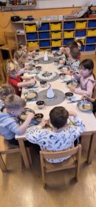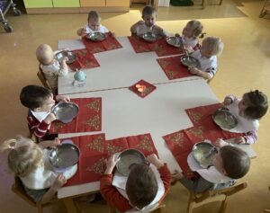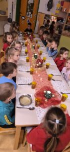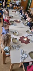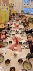 Otroci so skozi dejavnosti spoznavali, kako pripravimo praznično mizo – od pogrinjkov, prtičkov, razporeditve pribora. Poseben poudarek smo namenili prazničnim okraskom, ki so jih otroci soustvarjali sami. Z okraševanjem prostora in mize otroci razvijajo občutek za estetiko, ustvarjalnost ter veselje do skupnega dela.