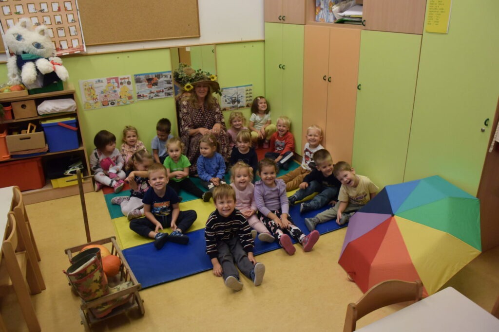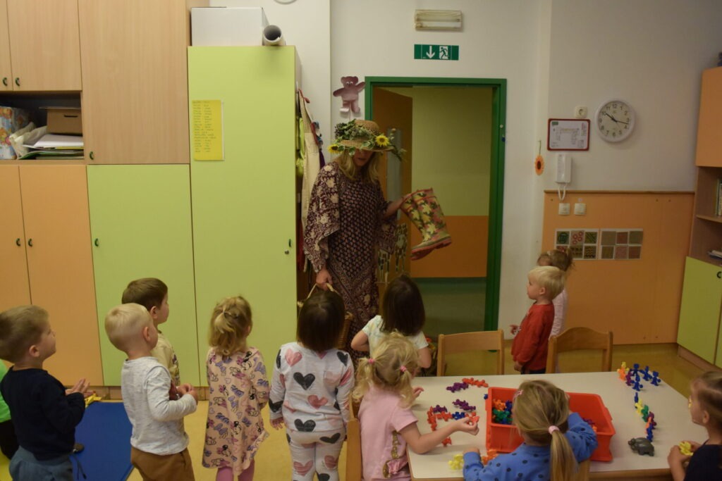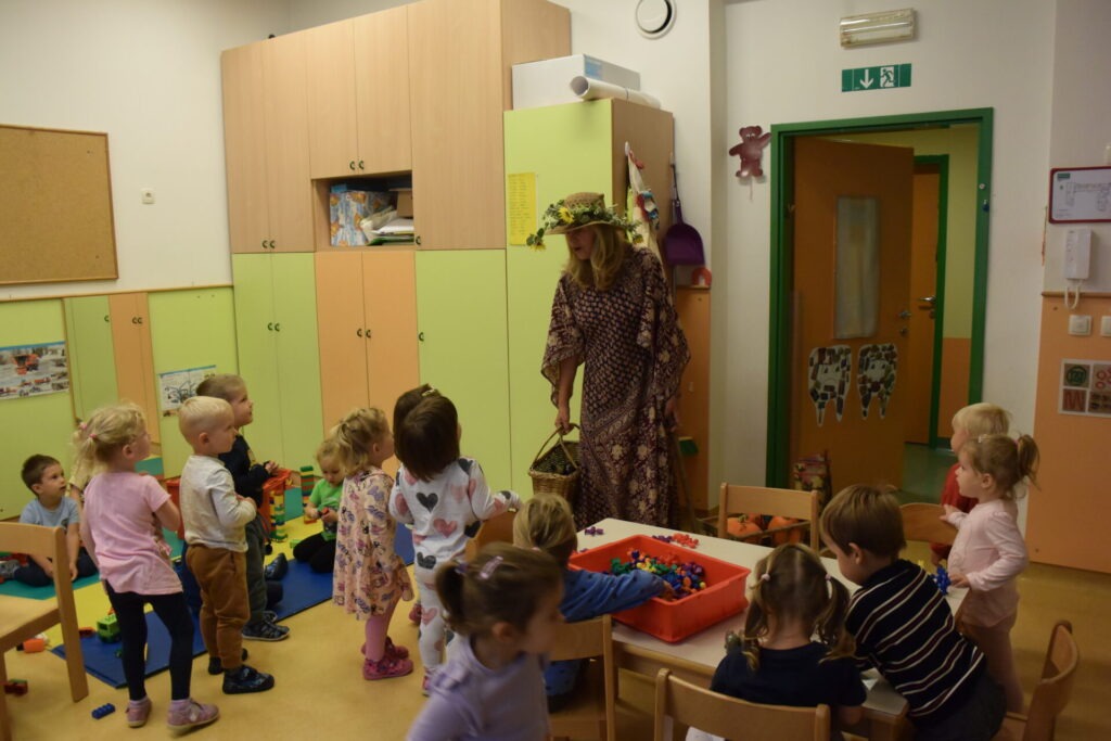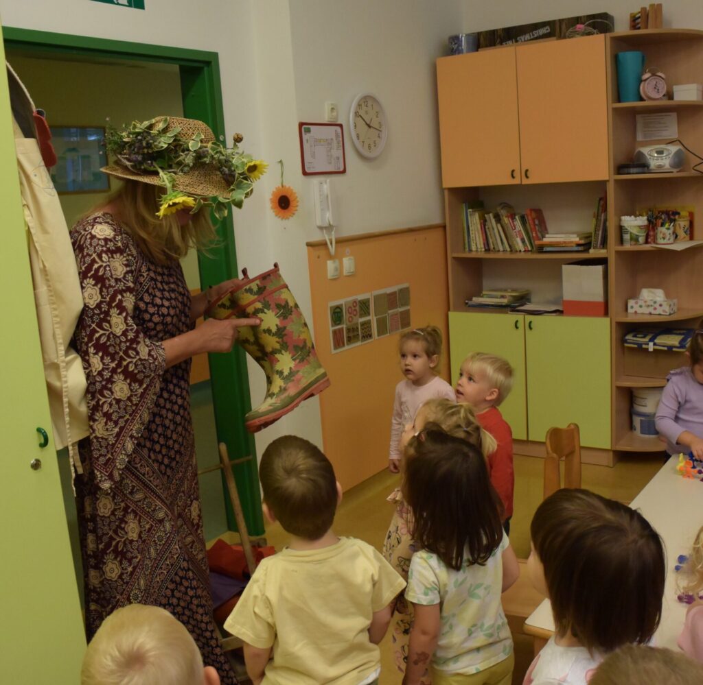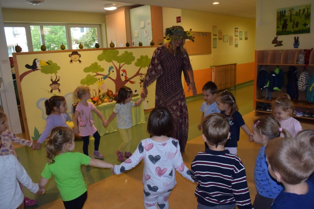 BOTRA JESEN (Janez Kuhar) Botra jesen že v deželo prihaja, z dežjem in vetrom nam rada nagaja. V polje in gozd je že urno zavila, barve jesenske povsod je razlila. S kapljico rose je barve zmešala, kaplje dežja pa še zraven dodala. Jesenski dnevi so polni čarobnosti, barv in topline – in prav takšna je bila tudi posebna gostja, ki nas je razveselila s svojim obiskom. V garderobo je prišla odeta v čudovite barve jeseni in na glavi je nosila poseben klobuk. V rokah je držala košaro, polno jesenskih dobrot in pridelkov. S svojo toplino in prijaznostjo je otroke…