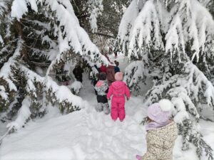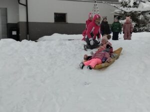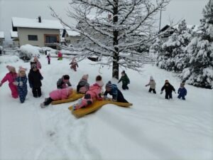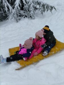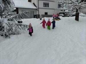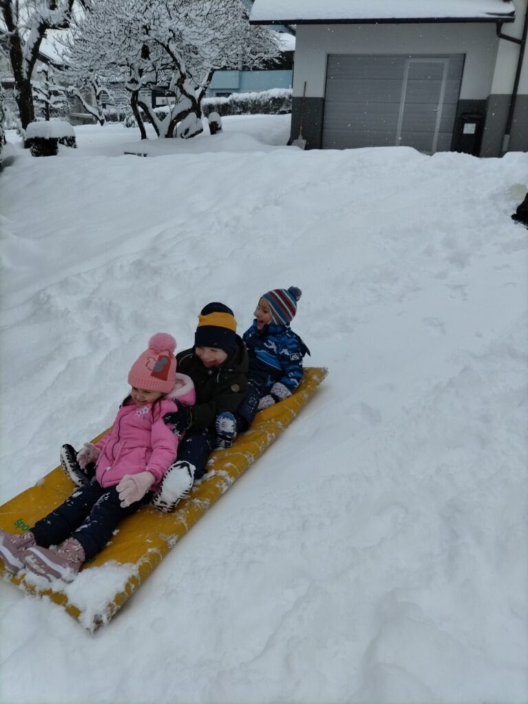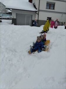 Odšli smo do Petrine hiše kjer je klančina in tam smo se spuščali z blazinami. Malo smo se kepali, delali angelčke v snegu in se skrivali pod zasneženimi krošnjami dreves.
