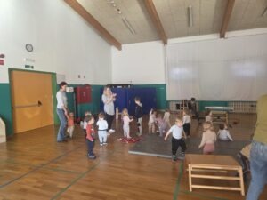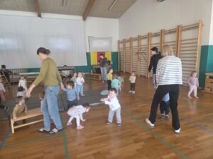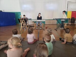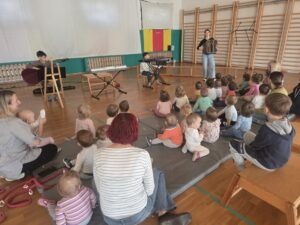 Danes smo se skupine Pikapolonice, Račke in Polžki zbrali v telovadnici, kjer so nam osnovnošolski otroci zaigrali nekaj pesmic na svoje instrumente.