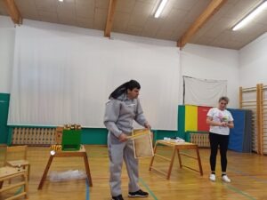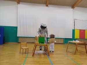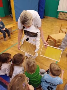Tudi otroci iz skupine Sovice in Muce se strinjajo s prvo črno mravljico. V ponedeljek, 17. 11., smo se tudi mi sladkali z domačim, Prusovim medom in ugotovili, da ima sladek okus, da nam pomaga, ko smo prehlajeni in da ga imamo vsi radi. Domač med nam je v vrtec prinesel g. Prus, čebelar, ki nam je predstavil poklic čebelarja, pripomočke, ki jih uporablja pri svojem delu, kako nastane med in tudi nekaj zanimivosti o čebelah.