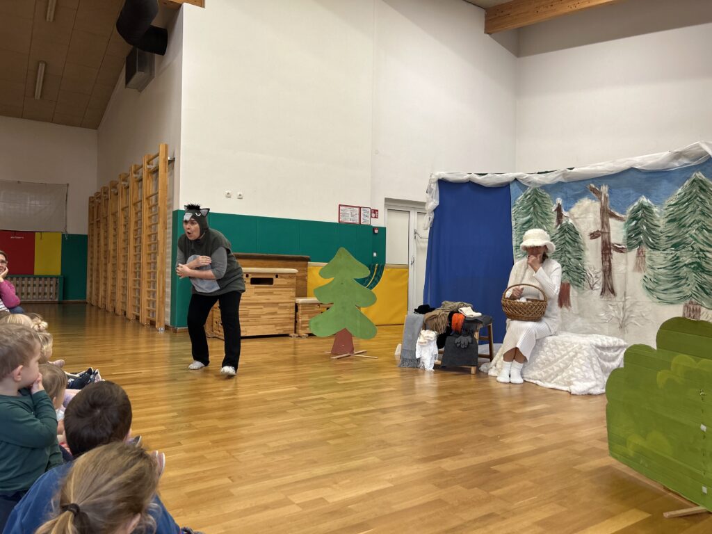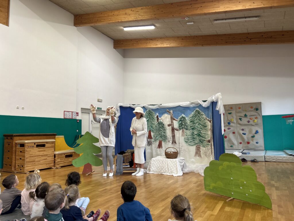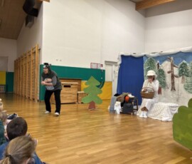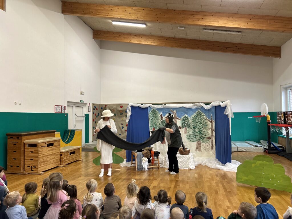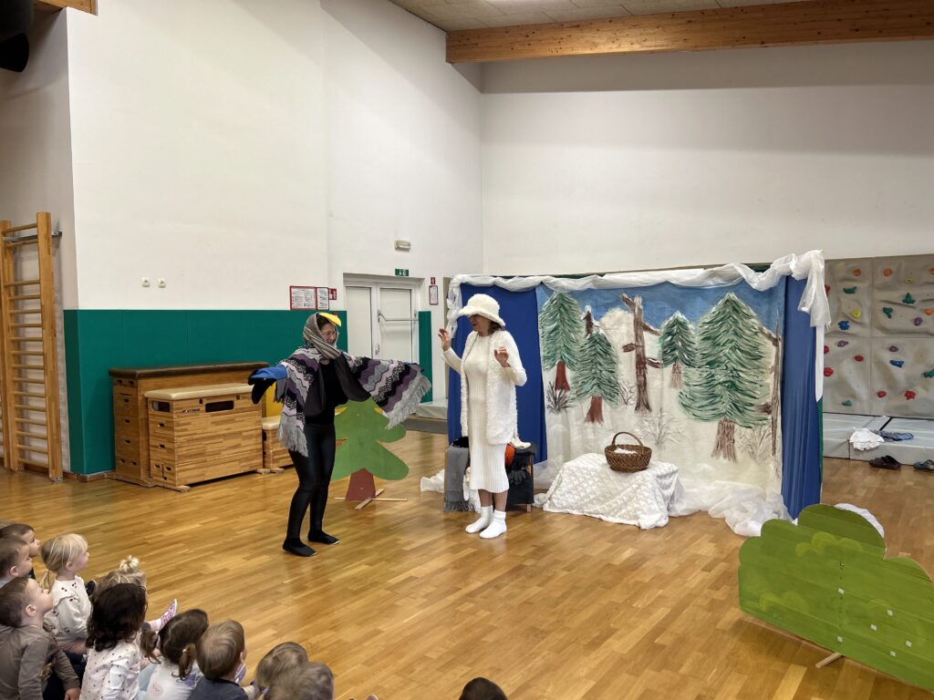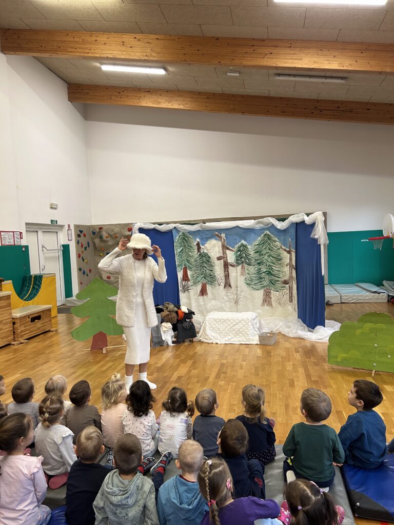 Na zadnji januarski petek smo vzgojiteljice starostnega tima 3–4 let iz skupin Sončki, Žabice in Ribice pripravile igrano predstavo za otroke z naslovom Živali pri babici Zimi. Na prijetno druženje smo povabile tudi skupino Lisičke.