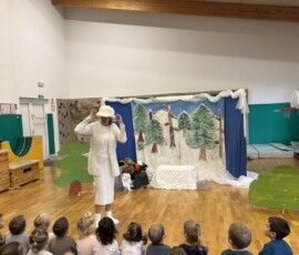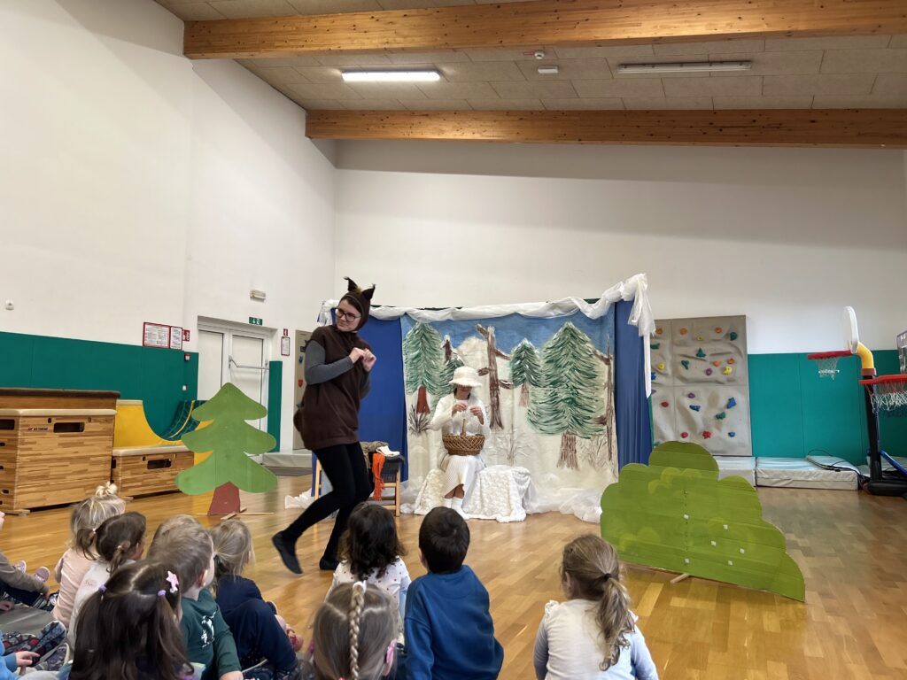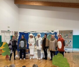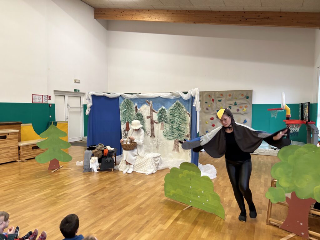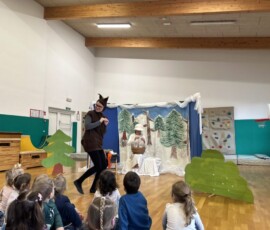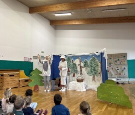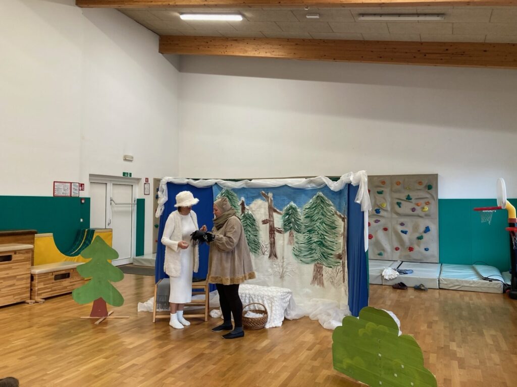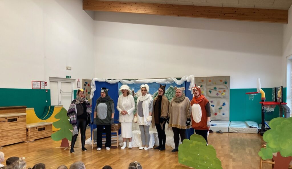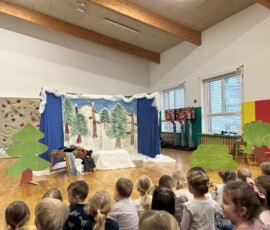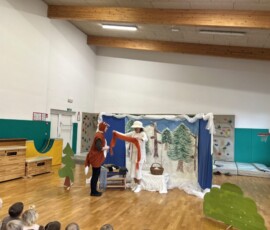 Na zadnji januarski petek smo vzgojiteljice starostnega tima 3–4 let iz skupin Sončki, Žabice in Ribice pripravile igrano predstavo za otroke z naslovom Živali pri babici Zimi. Na prijetno druženje smo povabile tudi skupino Lisičke.